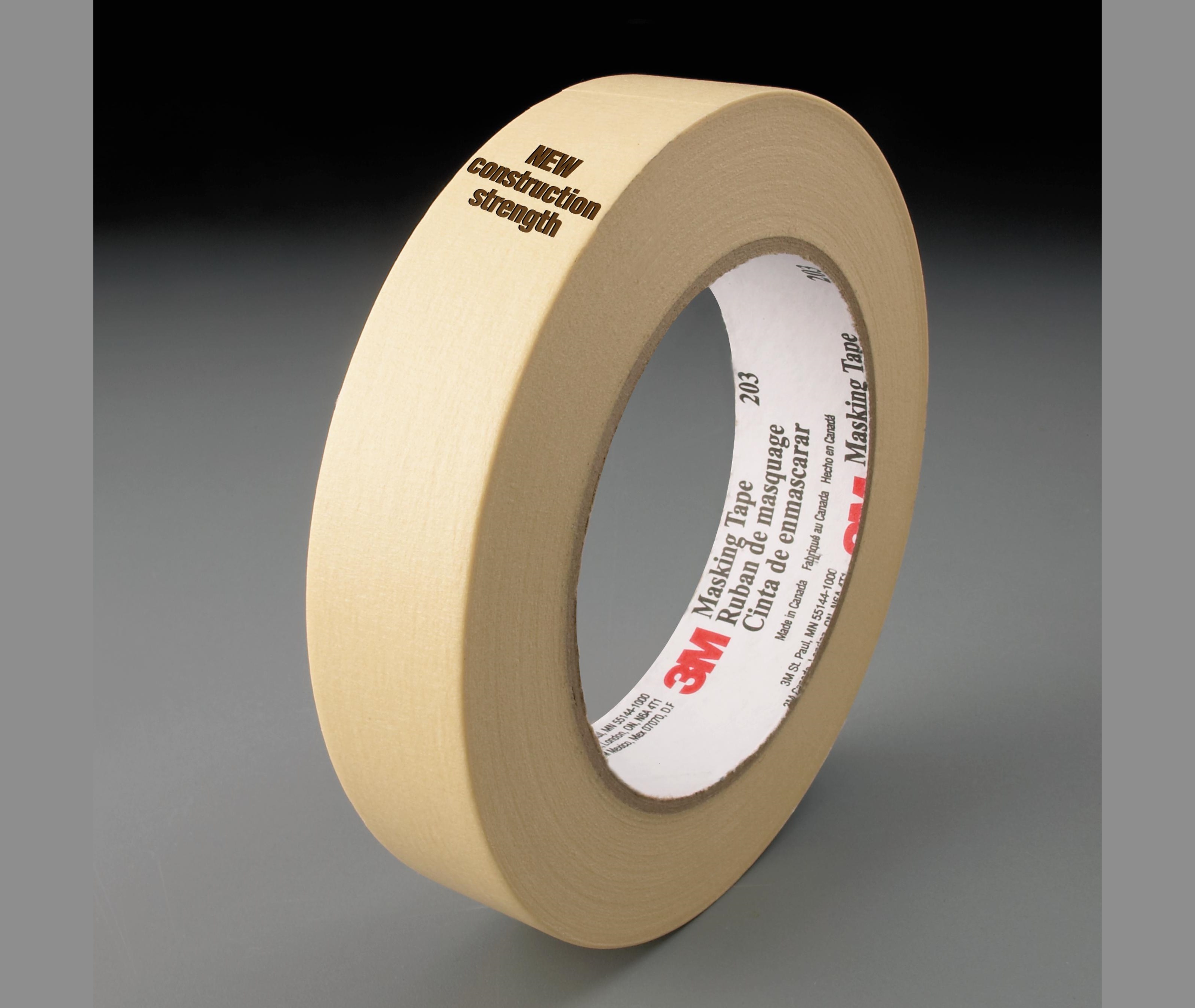 3M™ General Purpose Masking Tape 203 was designed to provide instant adhesion to a variety of surfaces. Its moderate adhesion supplies adequate holding power and helps resist lifting or curling. In addition, General Purpose Masking Tape 203 is conformable, maintaining integrity and seal when formed around corners and uneven surfaces. The crepe paper backing resists slivering and tears off the roll easily. With good paint hold-out and bleed-through resistance, this masking tape is ideal for many applications and removes cleanly from most substrates for up to 24 hours and has a temperature resistance of up to 200°F (93°C).