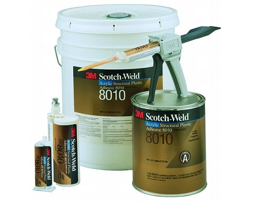 Our 3M™ Scotch-Weld ™ Acrylic Adhesive DP8010 starts with medium viscosity for controlled dispensing and spreads to sufficiently wet out the surface. The mix ratio is 10:1 and provides a 10 minute work life. The adhesive reaches handling strength in approximately 1 hour and is fully cured in 8-24 hours (at 72° F /22° C).