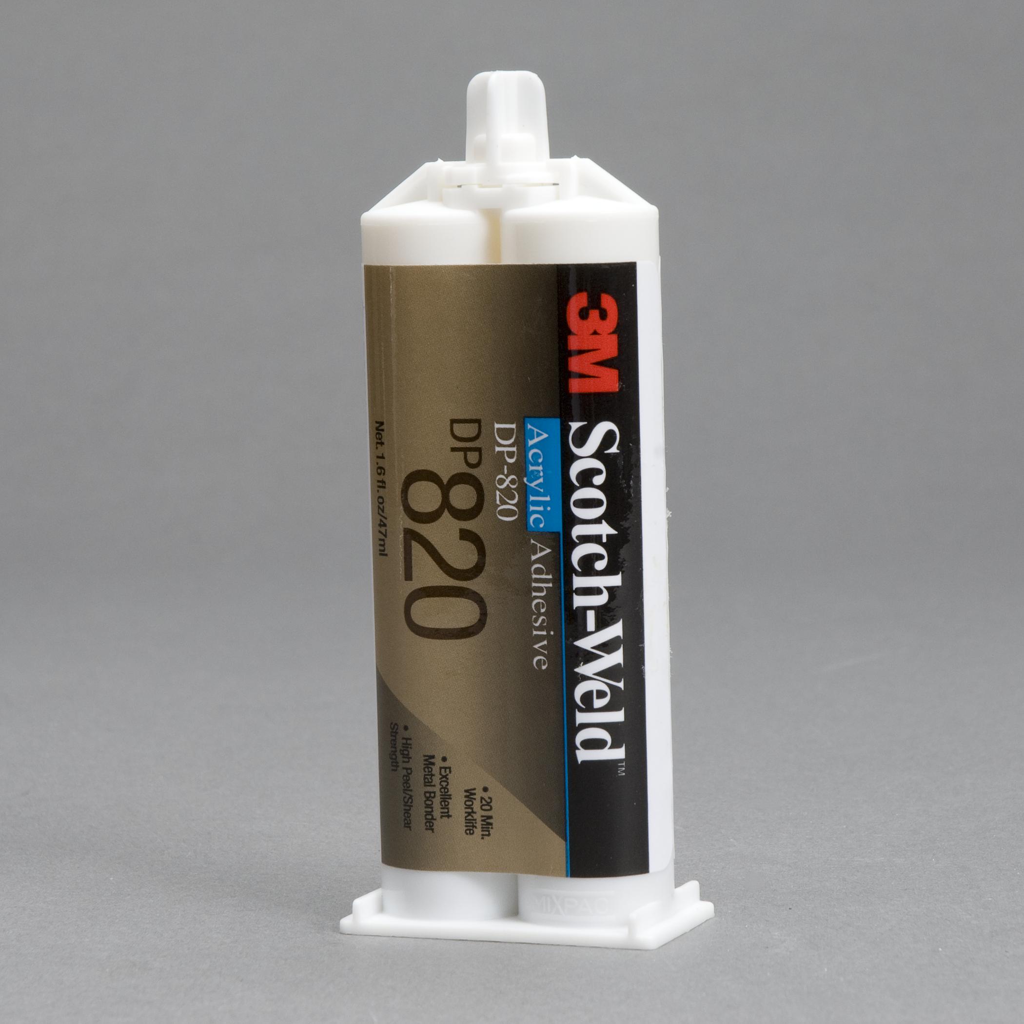 The mix ratio for our 3M™ Scotch-Weld™ Acrylic Adhesive DP820 is 1:1 for quick, precise dispensing. With an applied 15 minute work life there is some opportunity for positioning and adjustments after the adhesive is applied. This adhesive reaches handling strength in approximately 40 minutes and is fully cured in 48 hours (at 72°F/22°C).