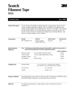Additional Product Information: Durable Temporary Holding Scotch® Filament Tape 8916 Clean Removal provides a reliable solution for temporary holding appliance parts and consumer goods during manufacture and shipping. Constructed with a clear, filament-reinforced, polypropylene backing, this tape is abrasion, moisture, scuff and break resistant, even if nicked or punctured. Its multi-layer synthetic-rubber adhesive system is specially formulated to provide high adhesion, stain resistance and clean removal on some surfaces. The synthetic adhesive bonds well to a variety of surfaces commonly used in packaging, such as corrugated cardboard, fiberboard, plastic and metals. Recommended Applications • Temporary holding and attachment applications The World’s Go-To Source for Filament Tapes Since 1946 3Ms line of filament-reinforced tapes and strapping tapes are high strength, reliable and affordable solutions that give you product and package integrity. For closing boxes, stabilizing pallets, bundling and reinforcing; securing appliance components during transport and easy-open tear strips, our high strength tapes provide important benefits for manufacturers of piping, metal products, furniture, appliances, automotive parts, sporting goods, as well as food and beverage processors.