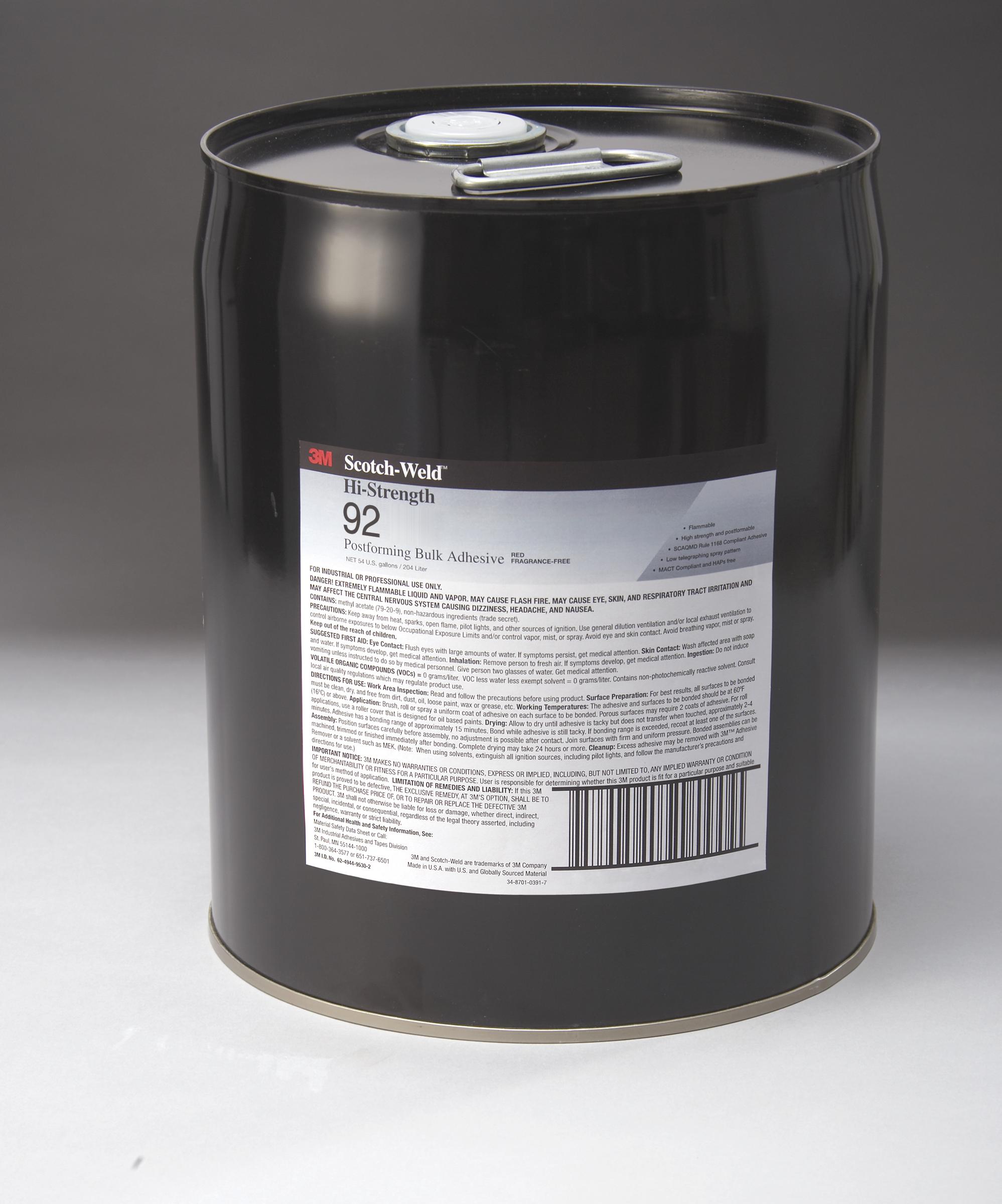 Formulated as a high-tack, industrial-grade spray adhesive, 3M™ Hi-Strength Laminating Adhesive 92 offers a strong hold and bonds to a variety of substrates. A high-performance, high-temperature resistant laminating adhesive, we designed this product to deliver durability and resilience. Our 3M™ Hi-Strength Laminating Adhesive 92 is also fast tacking for immediate handling, sticking confidently to almost any substrate. This high-strength spray adhesive is also formulated with exceptionally high solids, providing high coverage and production efficiency. In addition, this product is available in bulk containers, including barrels and drums, and its canister version is portable for easy transition and setup for multiple stations or field work.