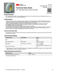 3M repulpable single coated splicing tape 9960 is part of an extensive line of splicing and repulpable tapes that can be used for core starting to roll closing / tabbing and all the splices in-between. Our totally repulpable line offers choices for the dependability you need to keep production at full speed. Backings and adhesives are engineered for optimum strength on every type of splice: flying, overlap, butt and generally purpose.