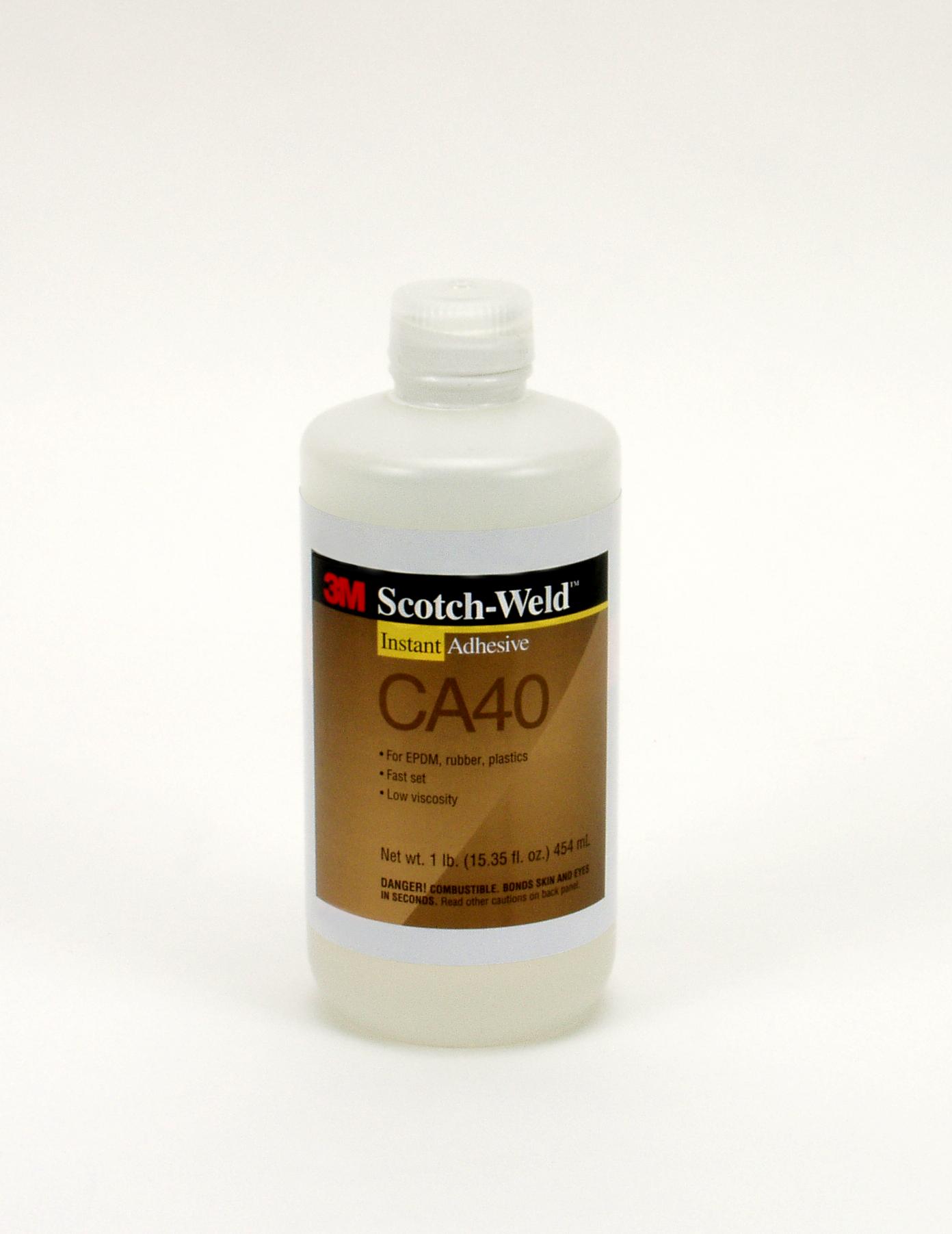 3M™ Scotch-Weld™ Instant Adhesive CA40 is a low viscosity instant adhesive. The CA40 instant adhesive is formulated to give exceptional strength and impact resistance on difficult to bond materials, including flexible vinyl and EPDM rubber. Once applied, the glue has fast handling time and cure to keep jobs moving quickly.