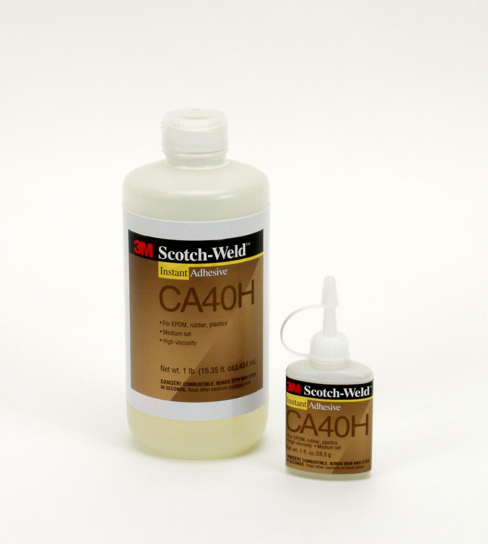 Our 3M™ Scotch-Weld™ Instant Adhesive CA40H is a glue that is easily applied with a thin bond line from a squeeze bottle and cures quickly. This cyanoacrylate adhesive is dispensed from a flexible container; pinch a precise drop or squeeze for a steady bead. It offers better void filling capabilities than many other lower viscosity instant adhesives.