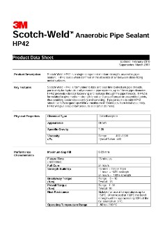 Our 3M™ Scotch-Weld™ Low Viscosity Air/Hydraulic Sealant HP42 is a one-component, anaerobic sealant that cures and seals hydraulic and pneumatic pipes and fittings. This general purpose, low viscosity pipe sealant is fast-curing, sealing almost instantly. It is formulated to resist pressure and vibration as well as lock and seal medium to coarse straight and tapered threads.